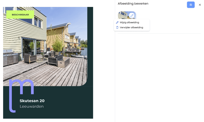 Standaard worden de eerste 4 afbeeldingen van de geselecteerde woning gebruikt. Je kunt de afbeeldingen verplaatsen door erop te klikken en naar de gewenste plek te verslepen.