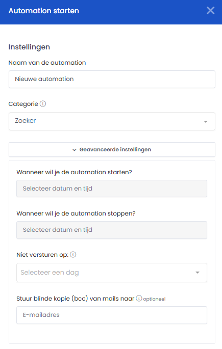 Bij het starten van een automation kun je verschillende instellingen aanpassen: