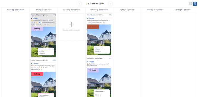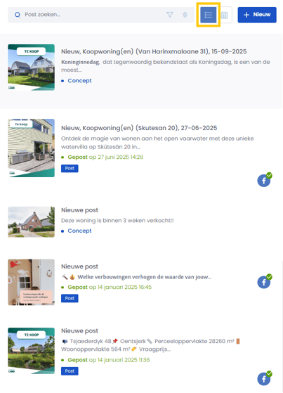 In de social media tool kun je al je geplaatste en ingeplande posts bekijken in twee handige weergaven: lijst en kalender. Zo houd je altijd overzicht en plan je eenvoudig nieuwe content.