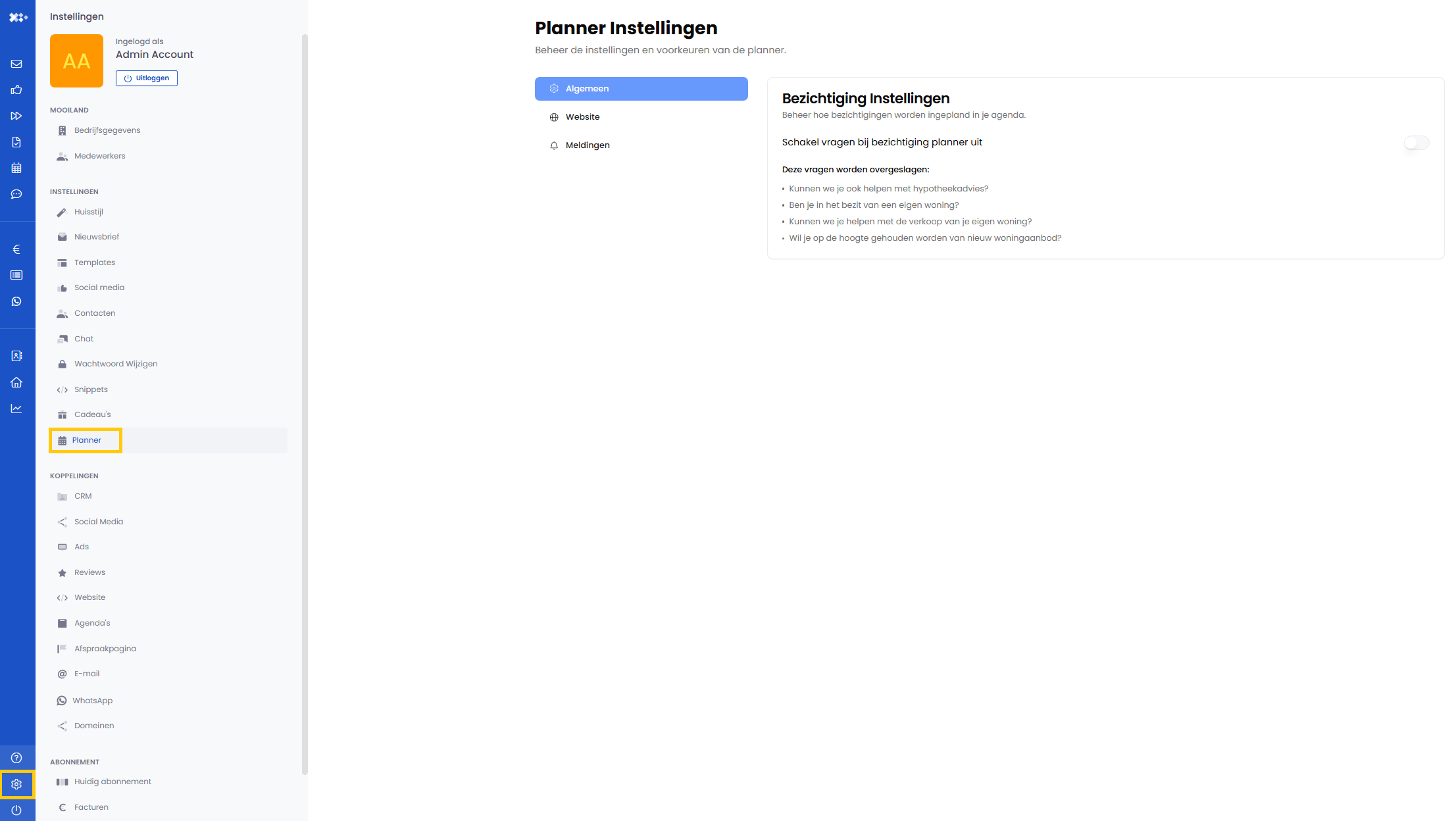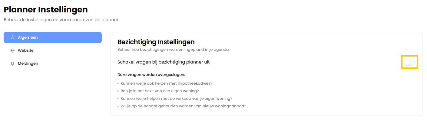 In de planner kun je instellen of er bij het inplannen van een bezichtiging extra vragen worden gesteld. Deze vragen helpen je om sneller relevante informatie van potentiële klanten te verzamelen.