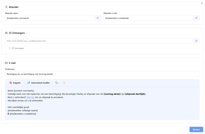 In de bezichtigingsplanner kun je alle meldingen en notificaties volledig naar wens instellen. Denk aan bevestigingen, herinneringen en updates via e-mail of WhatsApp.