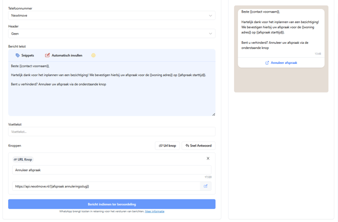 ➡️ Let op: Voor het activeren van de WhatsApp notificatie moet het bericht eerst zijn goedgekeurd door WhatsApp.