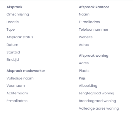 - Type – het type afspraak (bijvoorbeeld: bezichtiging).