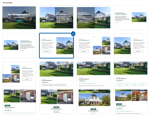 - Kies een template met bijvoorbeeld een witte achtergrond, overlay, meerdere afbeeldingen of woninggegevens.