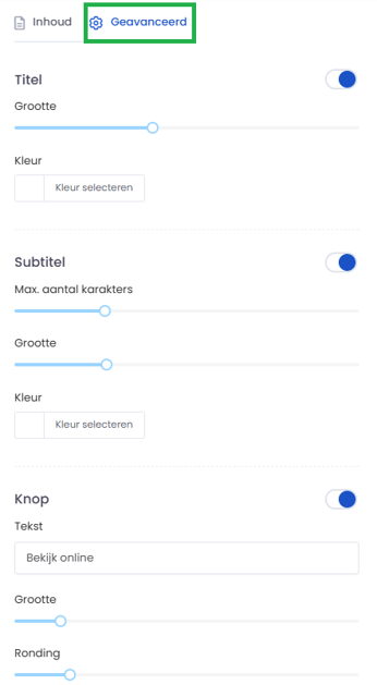 Gebruik de Geavanceerd optie om de grootte van de titel, subtitel, de tekst en de kleur van de knop aan te passen.