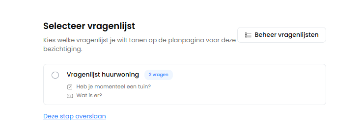 Wil je geen vragenlijst gebruiken? Kies dan Deze stap overslaan of klik op Verder.