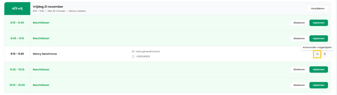 Het is ook mogelijk om vragenlijsten te beheren terwijl je een tijdsblok instelt.