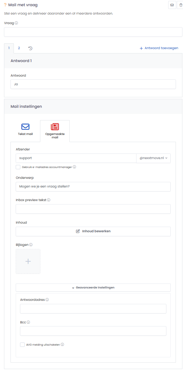 De mail met vraag geeft je de mogelijkheid om een vraag te stellen waarop je contact kan reageren. Het antwoord bepaalt vervolgens het vervolgpad in de automation.